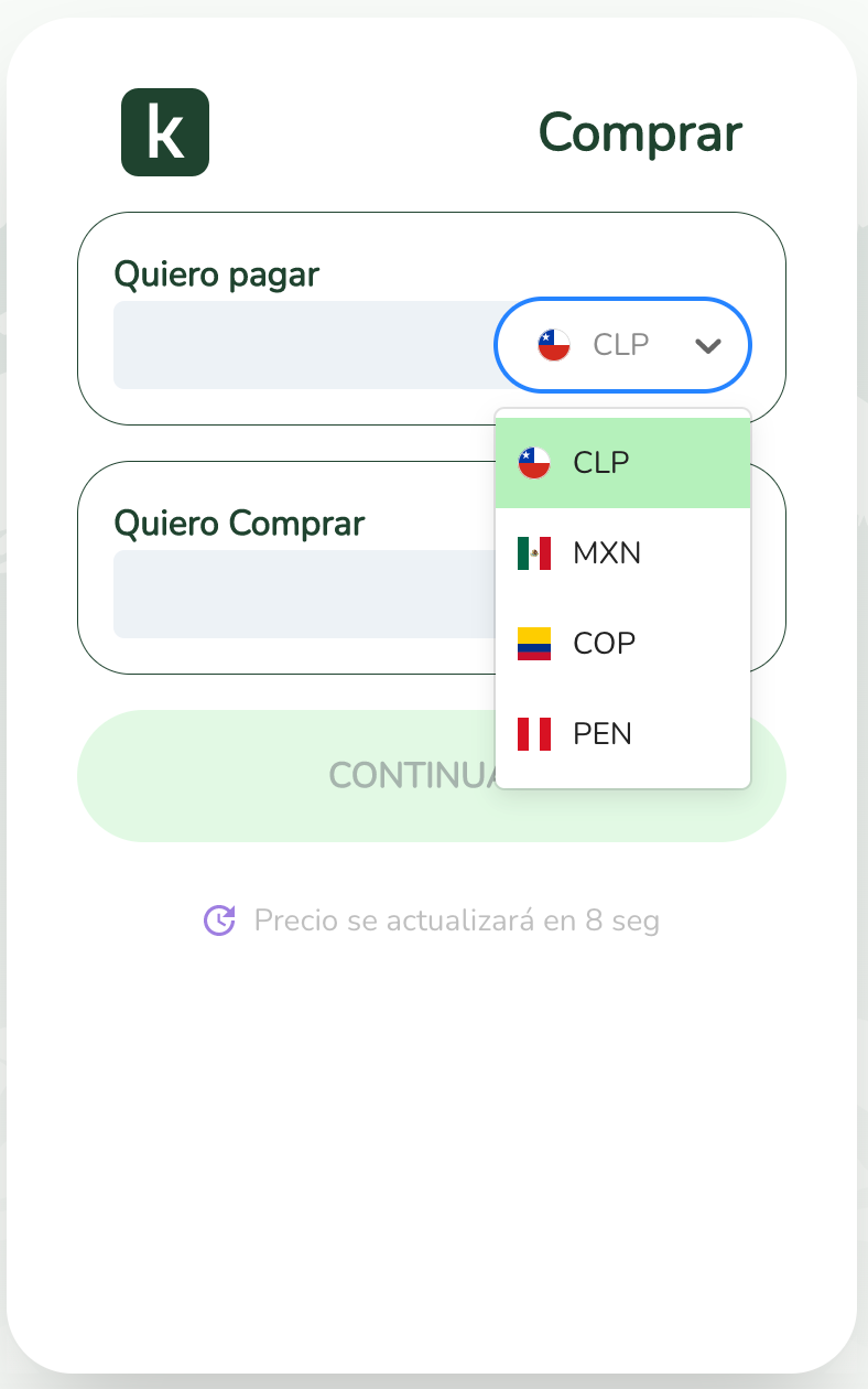 Importante: La moneda que elijas en este punto determinará la validación de identidad que tienes que hacer más adelante. De acuerdo a la regulación de cada país, puede que te pidamos más (o menos) datos.
